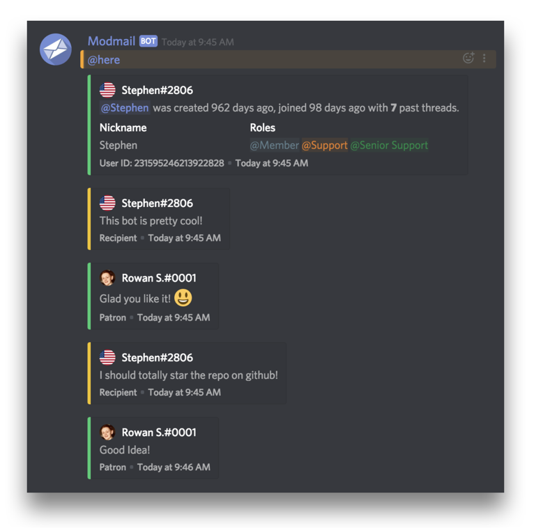 When a member sends a direct message to Modmail, the bot will create a channel (we call it a "thread") into a designated category. All further DM messages will automatically relay to that channel, then any available staff can respond within the channel. Compared to ticketing bots, Modmail allows easier and more organised discussions among staff.