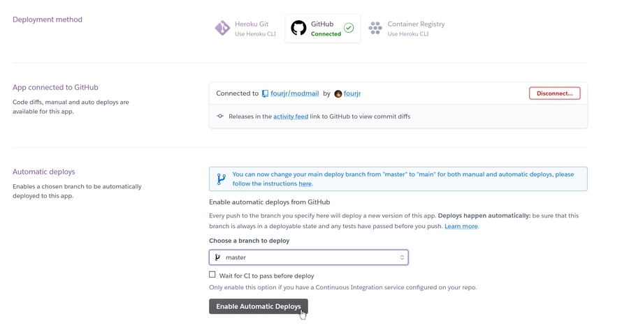You then want to go to your modmail application in Heroku, connect your modmail fork via the Deploy tab and deploy the master branch.